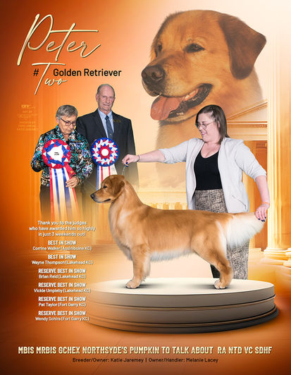 2025 is proving to be just as exciting for Mel and Pete! He is currently #2 Golden in Canada and has won 4 BIS and 10 RBIS to date. In March 2025, he finished off his Rally Advanced Title. In July 2025, Pete also picked up his first two Novice Obedience legs with two High in Classes.